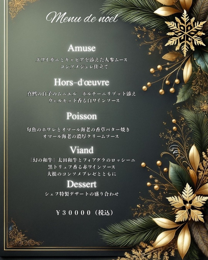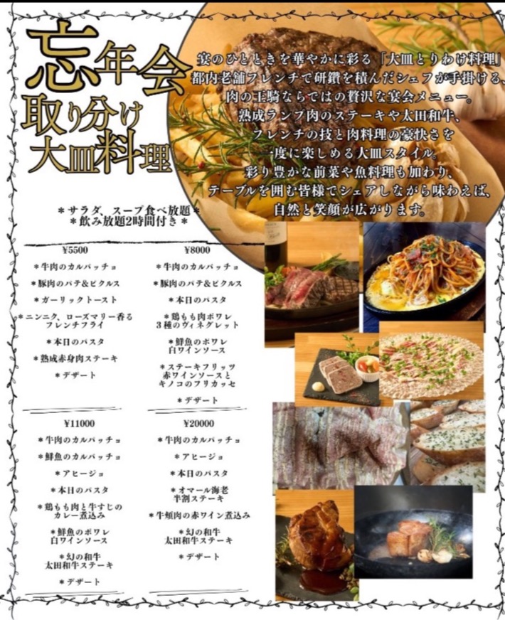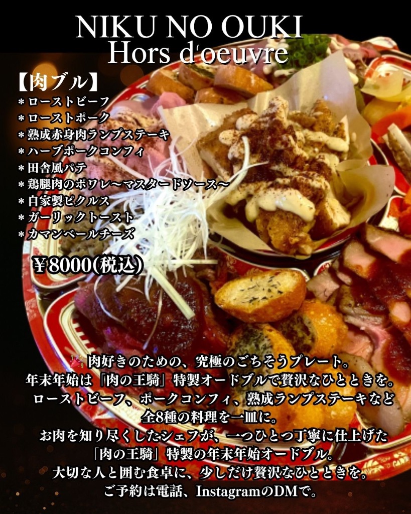 News お知らせ 2025/11/14 【2時間飲み放題付き|宴会プランのご案内】 🍽 肉の王騎では、各種宴会にぴったりの“2時間飲み放題付きプラン”をご用意しております。忘年会・新年会・会社の集まり・同窓会など、幅広いシーンでご利用いただける人気プランです。✨ 2時間飲み放題付き 宴会コース人数やご予算に合わせてご用意可能です。料理はシェフが季節食材を使用し、ボリュームも満足いただける内容となっております。📌 飲み放題メニュー例(ビール・ワイン・サワー・ハイボール・焼酎・ソフトドリンクなど)※詳細は店舗にてご案内いたします。 2025/11/14 【年末年始限定|肉の王騎スペシャルオードブル盛り合わせ】 🎍 【ご予約受付中】年末年始の食卓を彩る特製オードブル盛り合わせ肉の王騎では、年末年始だけの贅沢テイクアウトオードブルを数量限定でご用意しております。✨ 2つのラインナップ(量は同じ)・8,000円(税込)・15,000円(税込)※牛頬肉の赤ワイン煮込み・和牛ステーキ入りの特別仕様ご家族の集まりやお祝いの席にふさわしい、“肉の王騎らしさ”を詰め込んだ年に一度の限定オードブルです。 2025/11/14 🎄 【2025クリスマスディナー予約受付中】 群馬県伊勢崎市のフレンチレストラン 肉の王騎 では、12月20日〜25日の期間限定で“特別なノエルコース”をご提供いたします。✨ 全5品のフルコース(¥30,000税込)・ズワイガニとキャビアの人参ムース(アミューズ)・真鱈の白子ムニエルとポルチーニリゾット(前菜)・旬魚のポワレ&オマール海老のクリームソース(魚料理)・幻の和牛「太田和牛」とフォアグラのロッシーニ(肉料理)・シェフ特製デザート盛り合わせ冬の食材を贅沢に使い、香り・旨味・余韻まで楽しめる、一年に一度の特別なディナーです。📍 群馬県伊勢崎市📅 開催期間:12/20〜12/25💴 価格:¥30,000(税込)📞 ご予約・お問い合わせはお電話またはInstagramのDMから✨お席には限りがございます。大切な方とのクリスマスの思い出に、ぜひご利用ください。 VIEW MORE About us 肉の王騎について 希少な幻のA5神戸牛「但馬太田牛」Rare & Exclusive: A5 Tajima Ota Beef from Hyogo 兵庫・但馬地方の名門・太田牧場で育てられた「但馬太田牛」は、A5格付けの神戸ビーフとして希少価値が高く、関東には週に1頭しか入荷しない限定ブランド 。ストレスフリーな環境&専用配合飼料で育成された高品質な和牛を、フレンチ技法+鉄板で香ばしく提供します。ーーーーーーーTajima Ota Beef, raised at the renowned Ota Farm in the Tajima region of Hyogo Prefecture, is an A5-grade Wagyu with exceptionally high quality and rarity.Recognized as one of the finest types of Kobe Beef, only one head is shipped per week to the Kanto area, making it extremely exclusive.Raised in a stress-free environment and fed a special blend of premium feed, this Wagyu is renowned for its deep flavor and refined texture.At Nikuno-Ouki, we elevate it further with French cooking techniques and a teppan-seared finish, delivering an unforgettable steak experience. 東京老舗フレンチで料理長経験があるシェフが手がける“肉×フレンチ”Tokyo French chef’s signature meat cuisine. シェフは、東京の有名フレンチレストランで15年にわたり料理長を務めた実力派。上質な肉とフランス料理の技法を融合させたオリジナルの肉料理は、見た目も味もまるで芸術作品のようです。中でも、お箸で切れるほどやわらかい国産牛頬肉の赤ワイン煮込みや“食鳥の女王”と称される希少なほろほろ鳥など希少な料理も当店の名物。前菜やデザートに至るまで、“旅の思い出になるほど美しい”と国内外のゲストから高い評価をいただいています。ーーーーーーーーーーOur chef is a seasoned professional who served as the head chef at a renowned French restaurant in Tokyo for 15 years.He creates original meat dishes that fuse premium Japanese ingredients with classic French techniques — each plate is a work of art in both flavor and presentation.Among our signature dishes are the braised domestic beef cheek in red wine, so tender it can be cut with chopsticks, and the rare guinea fowl, known as the “Queen of Poultry.”From appetizers to desserts, every dish is praised by both local and international guests as “beautiful enough to be a highlight of your journey.” 群馬・伊勢崎でお酒と肉を楽しむなら 肉の王騎へ 群馬県伊勢崎市で美味しい肉料理と一緒にお酒を楽しめるお店をお探しなら、肉の王騎へ。赤身ステーキや牛ほほ肉の赤ワイン煮込みなど、食べ応えのある肉料理にぴったりのビール・ワイン、ハイボール・サワー、焼酎・などをご用意。伊勢崎での飲み会、女子会、会社の宴会、家族との食事会にも最適な空間で、落ち着いた雰囲気の中ゆったりと過ごせます。10名以上の貸切(ご予算による)や、懐石フレンチコース、宴会コース・飲み放題プランもご相談可能。地元・伊勢崎で「お酒をゆっくり楽しみたい」「お肉と一緒に飲みたい」方は、ぜひ一度ご来店ください。 VIEW MORE Menu メニュー VIEW MORE Take out テイクアウト VIEW MORE Course コース VIEW MORE