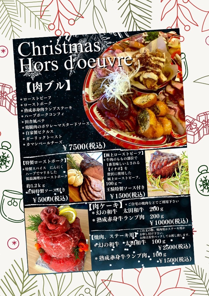 お家で過ごすクリスマスも盛り上がること間違いなしの、お肉づくしのオードブル盛り合わせもご用意しております🏠💫。おうちでのパーティーが一層華やかになることでしょう🎉🥩。